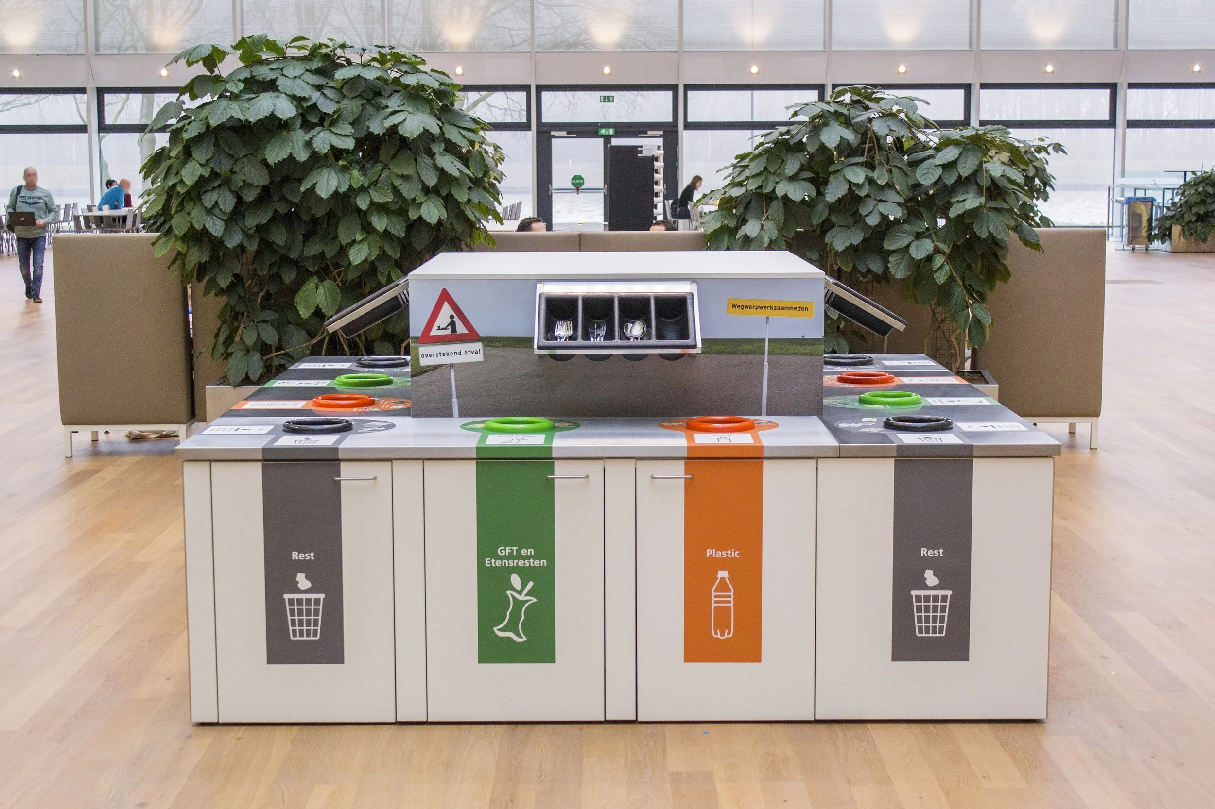 Voor het ontwerp voor de wegwerpwerkzaamheden hielden we drie lijnen in het oog. Het ontwerp moet in eerste instantie duidelijk communiceren over het afval. Op afstand moet je herkennen dat het een afvalstation is en welke afvalstromen hier te recyclen zijn. Dichterbij krijg je aanvullende informatie die helpt bij het correct scheiden. Als deze basis correct is kunnen we het ontwerp gaan verpakken. In dit geval maakten we eerst een duidelijke verwijzing maken naar de opdrachtgever en haar activiteiten, om die vervolgens aan te vullen met enkele ludieke elementen waarmee we extra de aandacht trekken. Resultaat is een helder afvalmeubel dat correct scheiding bevordert terwijl het ontwerp een interessante toevoeging is in het interieur.