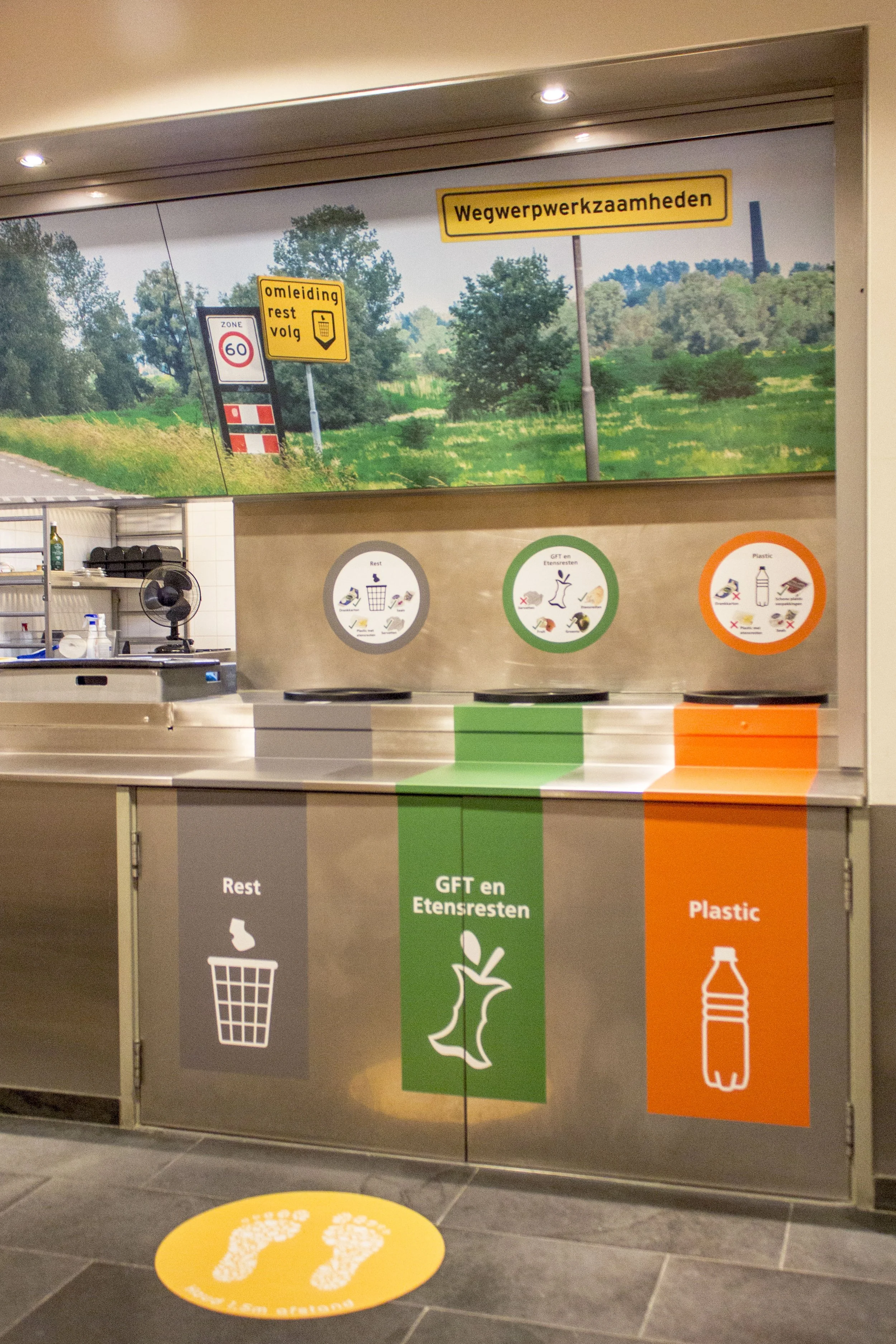 In 2020 kwamen we in gesprek met het team ‘restafval reductie’ van Rijkswaterstaat. Afvalscheiding bij een afvalmeubel op de hoofdlocatie in Utrecht was nog niet optimaal. Het principe ‘Let’s make recycling fun!’ trok ze aan samen bedachten we een pilot. Met de ambitie om de scheiding te verbeteren verzorgden wij een afvalmeting, kwamen met een eenvoudige rebranding van het meubel en onderzochten de impact. Opvallende uittingen trekken de aandacht terwijl grafische structuur zorgt voor helderheid. We doopten het om tot de ‘wegwerpwerkzaamheden’ en rollen dit concept stap voor stap uit over kantoren van Rijkswaterstaat door heel Nederland. Van idee t/m eindproduct wordt door ons verzorgd.