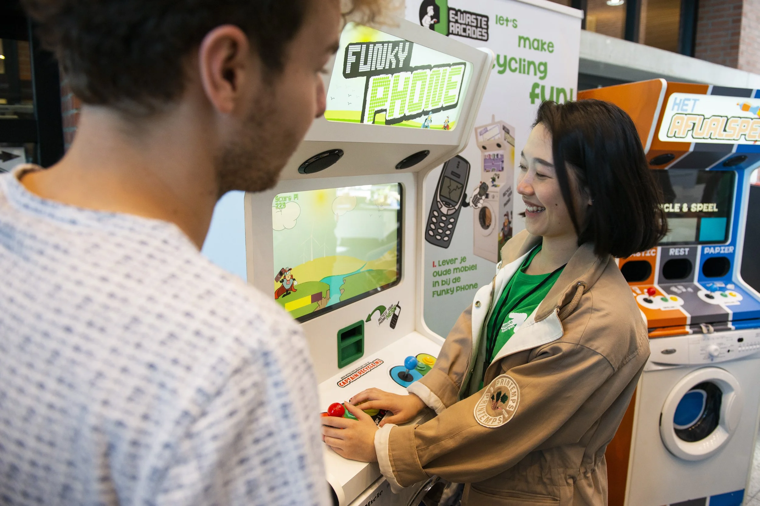 Er zijn twee typen E-waste Arcades. We begonnen met de Funky Phone, een spelkast volledig gericht op elektronisch afval. Dit eerste model liet je een oude telefoon recyclen waarna je als beloning een spel mocht spelen. In 2018 ontstond na een samenwerking met NS Stations de eerste Afval Arcade, een spelkast gericht op de meer reguliere afvalstromen als plastic, papier en rest. Bij moderne arcades gebruiken we naast of in plaats van belonen voor het weggooien van afval steeds vaker een ‘free-play’ button met als doel dat zoveel mogelijk gebruikers een leuke duurzame ervaring kunnen opdoen met de E-waste Arcade.