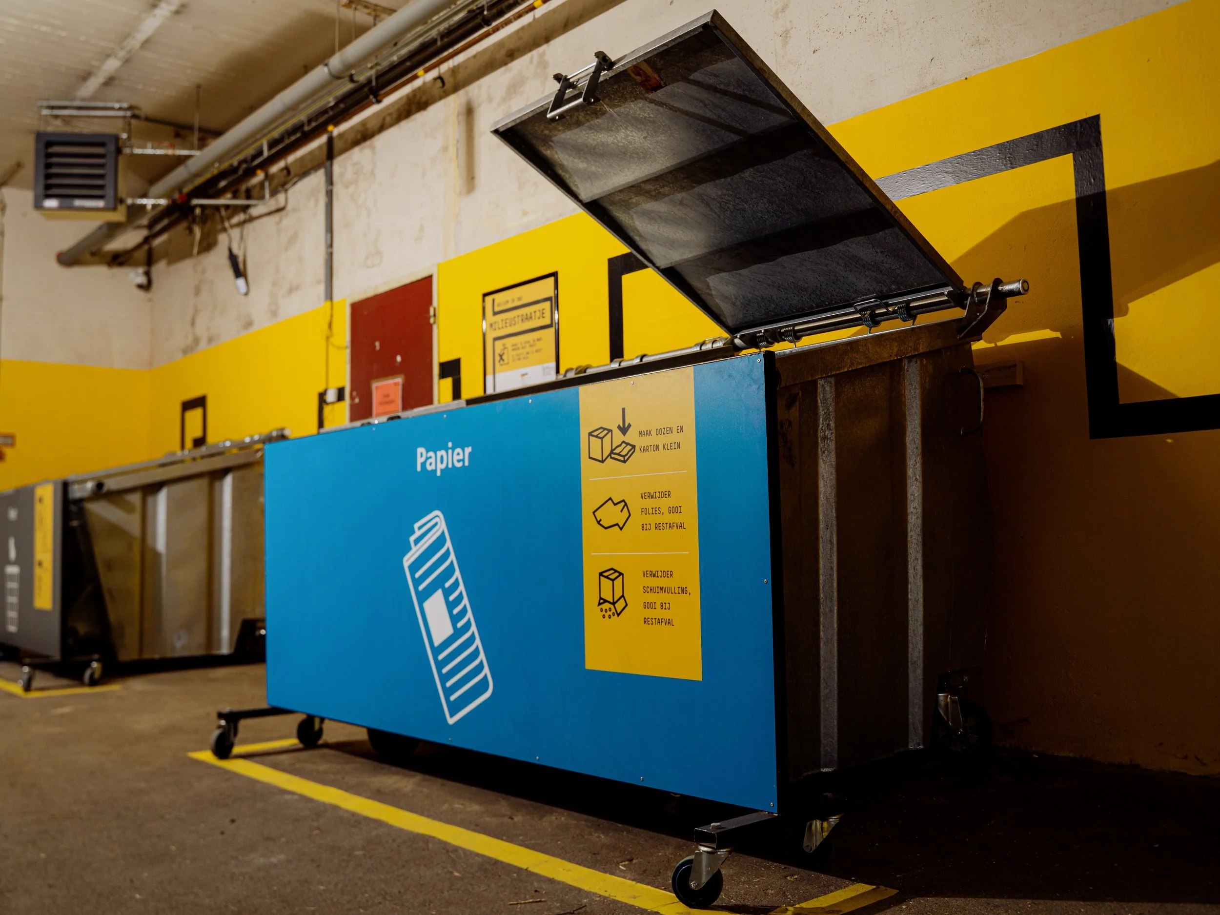 Uit onderzoeken blijkt dat een plek die schoon is beter schoon blijft. Vertaal je dit naar een kantoorpand dan zorgt heldere branding én organisatie van afvalbrengstations voor een schoner pand én een professionele uitstraling. Bij PLAN-B brachten we in kaart welk type afval ondernemers in het pand kwijt wilden en konden. We bekeken welke afvalstromen veel voorkwamen en tevens waar we fouten opmerkten. Denk aan bijplaatsing maar ook afval dat niet thuis hoort in een specifieke container. Inzichten werden omgezet in een plan voor interne containers én de letterlijke vertaling naar een kaart waarop ondernemers kunnen zien welke afvalstromen waar aan te bieden. Is er geen container voor in het pand? Dan brengt de kaart je naar een locatie in de buurt waar je het afval kwijt kan. Deze hand-out wordt digitaal én in print aangeboden aan huurders. Afvalstations in het pand zijn in lijn met de branding van het pand opgeknapt, soms als community activiteit met huurders.